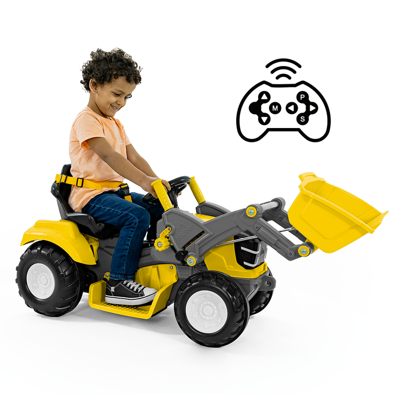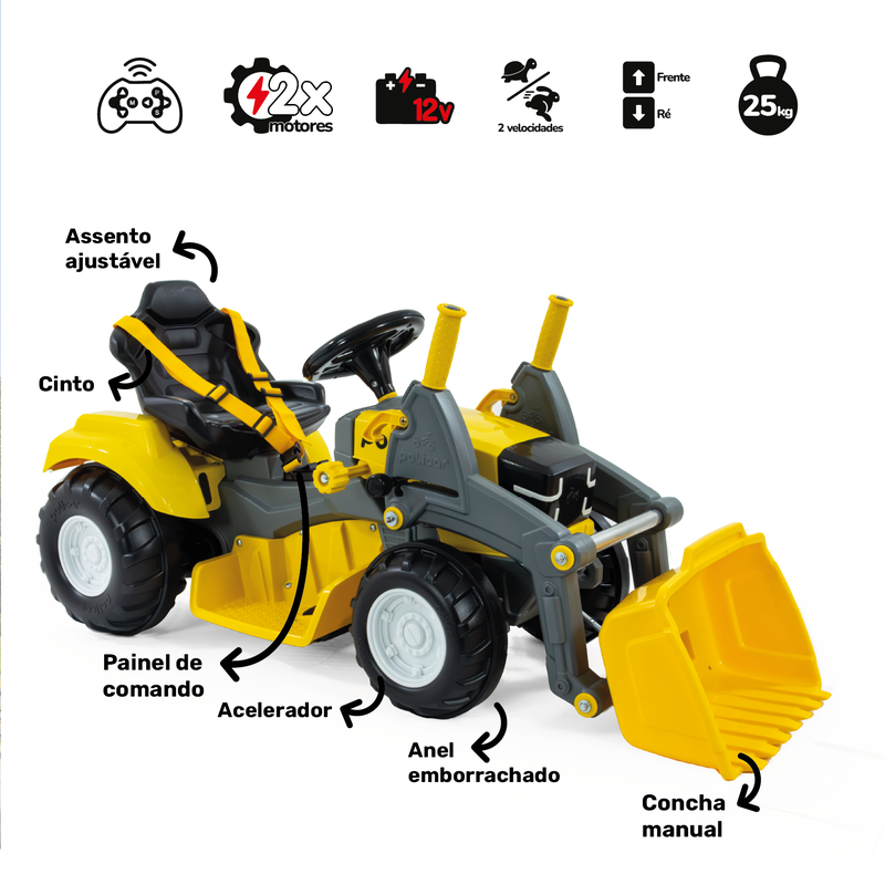 Com visual robusto e cheio de detalhes, o Politractor Elétrico com concha é ideal para crianças a partir de 2 anos e até os 25kg. Vem equipado com bateria 12V, carregador bivolt com LED indicador, duas velocidades + marcha ré, e um painel de comando simples e intuitivo. Ele é 2 em 1 oferecendo ainda mais flexibilidade: pode ser controlada tanto a distância pelo controle remoto, como manualmente pela criança dentro do veículo. A direção é leve e o pedal acelerador sensível garante um passeio mais controlado e seguro. Possui assento ajustável em 2 posições, cinto de 3 pontos e rodas com anel emborrachado para mais aderência e conforto. E o destaque vai para a concha basculante manual, que deixa a brincadeira ainda mais real! Com o Politractor Elétrico, é só acelerar e viver grandes aventuras ao ar livre!