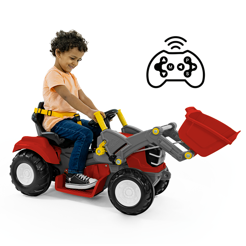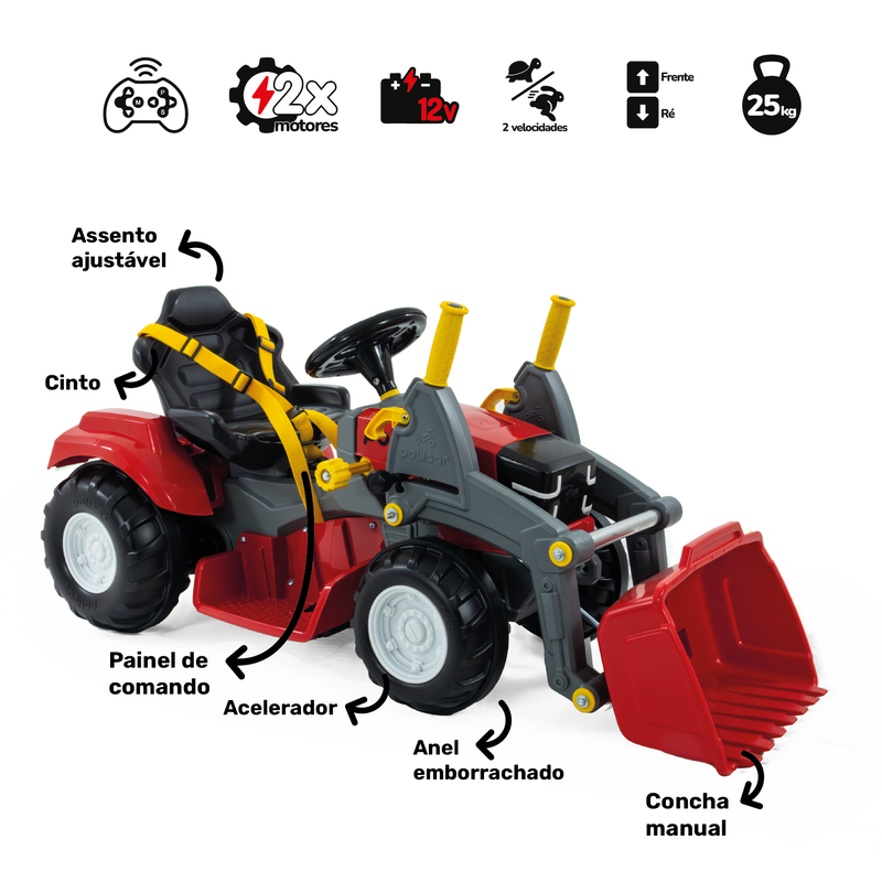 Com visual robusto e cheio de detalhes, o Politractor Elétrico com concha é ideal para crianças a partir de 2 anos e até os 25kg. Vem equipado com bateria 12V, carregador bivolt com LED indicador, duas velocidades + marcha ré, e um painel de comando simples e intuitivo. Ele é 2 em 1 oferecendo ainda mais flexibilidade: pode ser controlada tanto a distância pelo controle remoto, como manualmente pela criança dentro do veículo. A direção é leve e o pedal acelerador sensível garante um passeio mais controlado e seguro. Possui assento ajustável em 2 posições, cinto de 3 pontos e rodas com anel emborrachado para mais aderência e conforto. E o destaque vai para a concha basculante manual, que deixa a brincadeira ainda mais real! Com o Politractor Elétrico, é só acelerar e viver grandes aventuras ao ar livre!